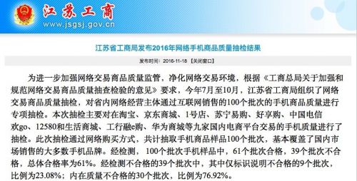 據了解,江蘇省工商局組織了網絡交易商品質量抽檢,對省內網絡經營主體通過互聯網銷售的100個批次的手機商品質量進行專項抽檢。本次抽檢主要對在淘寶、京東商城、1號店、蘇寧易購、好享購、中國電信歡go、12580和生活商城、工行融e購、華為商城等九家國內電商平臺交易的手機質量進行了抽檢。其中囊括了國內手機市場網購的主要平臺。