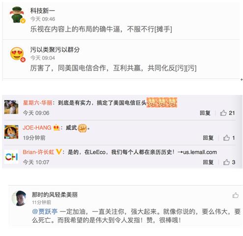 樂視與AT&T的戰略合作也引發到了網友的熱議。有科技互聯網意見領袖表示,樂視內容確實牛逼,不服不行;有微博粉絲認為:樂視是一家真正有實力的公司,正在書寫歷史;更多網友,為樂視加油,希望樂視能用實際行動見證偉大時刻。