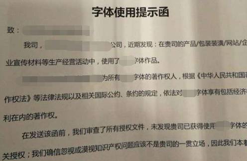 此前有商家向億邦動力網反饋,收到某公司的“字體使用提示函”,稱其在產品/包裝裝潢/網站/企業宣傳材料等生產經營活動中,使用了該公司的字體,但沒有獲得授權。該公司要求商家與其聯系,協商獲得授權。
