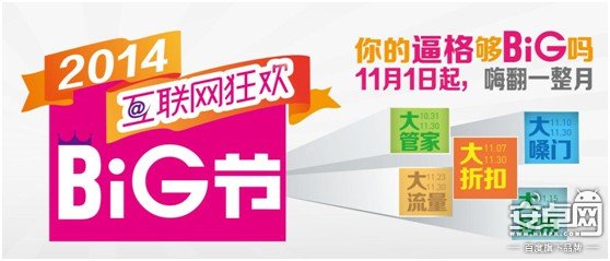 2014年在通信+及互聯網+的共同發展下,10月底,湖南聯通BiG節第一屆正式啟動,為網友量身規劃了大折扣、大管家、大流量、大嗓門、大應用等系列活動。用戶在活動中可享受到各種優惠、各種福利前所未見,iPhone6隨便搶、流量放肆用、禮包瘋狂送,堪稱湖南聯通2014年最大力度的一次營銷活動,力求讓用戶狂歡整個11月,誓將BiG進行到底!