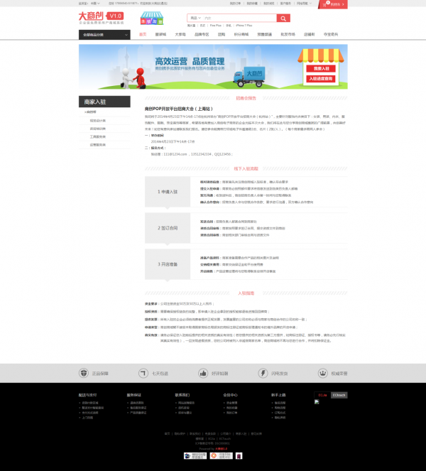 大商創的商家入駐模塊較為復雜,除了需要上傳標準的證件之外,還需要上傳行業特定證明,比如食品檢驗檢疫標志等等,而且整個入駐流程分很多步驟。
