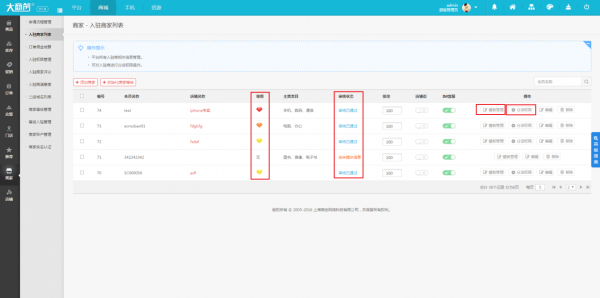 入駐商家審核、分配權限,列表清晰,操作方便。
