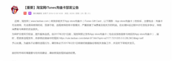 淘寶官方表示,大量買家在買到App store充值卡后發現充值卡無法使用,或無法查詢使用時間,且這些充值卡貨源不明,甚至是通過違規使用信用卡等方式得來,不僅買家的利益遭受損失,也容易與商家起糾紛。另外淘寶也提示賣家,2月1日前仍可銷售App store充值卡,但2月1日后若繼續銷售則有可能受到相關處罰,請盡快處理庫存。