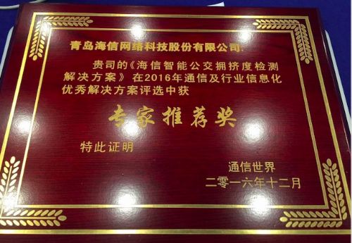 青島海信網絡科技有限公司的《海信智能公交擁擠度檢測解決方案》在2016年通信及行業信息化優秀解決方案評選中獲得優秀解決方案獎。