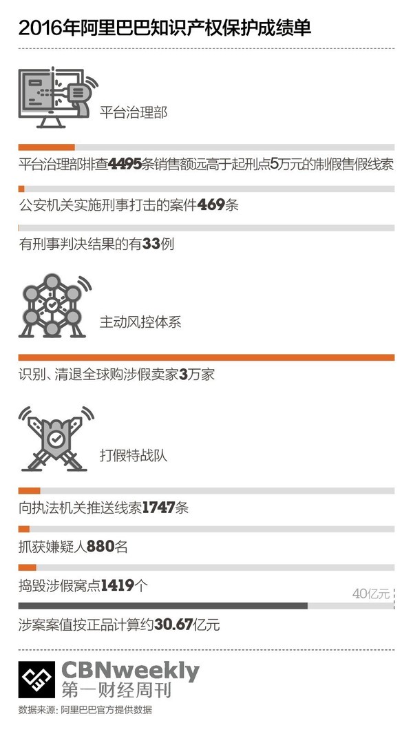 2015年年底,阿里巴巴成立平臺治理部,把原本散落在各個部門、負(fù)責(zé)知識產(chǎn)權(quán)保護(hù)的人員整合到新部門,統(tǒng)一管理和決策。平臺治理部下面包括了知識產(chǎn)權(quán)保護(hù)團(tuán)隊、主動風(fēng)控團(tuán)隊、治理劣質(zhì)商品的商品管理團(tuán)隊和治理炒信的團(tuán)隊。