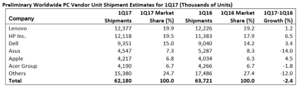 Q1全球PC出貨量降2.4% 連續(xù)10季度下滑