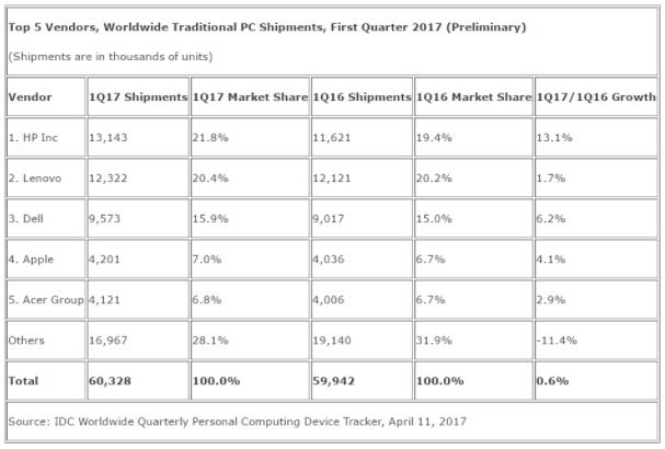 與此同時(shí),IDC發(fā)布的報(bào)告顯示,今年第一季度全球PC出貨量同比增長(zhǎng)0.6%至6030萬(wàn)臺(tái)。IDC稱,前五大PC廠商是惠普、聯(lián)想、戴爾、蘋果以及宏碁,惠普的份額為21.8%,高于聯(lián)想的20.4%。