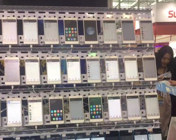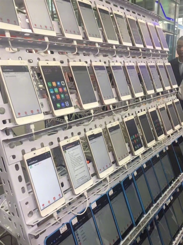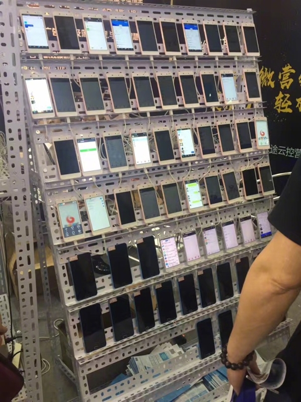 而在現場,有網友發現“微信刷量工具”竟然也來參展。這種系統名為“群控系統”。一個鐵架子上擺著七八十部智能手機,專門用來刷流量,很多閱讀10萬+就是這么來的。