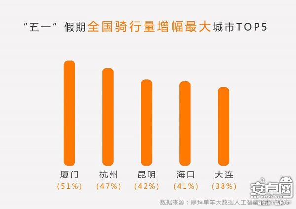 這份根據摩拜單車營運情況得出的報告稱,“五一”小長假期間,全國共享單車騎行熱度環比提升17.2%,而熱門旅游城市的騎行量增幅顯著高于一線城市。其中,廈門、杭州、昆明位居全國所有城市騎行量增幅前三甲;天津則以36%的環比增幅,超越北上廣深。