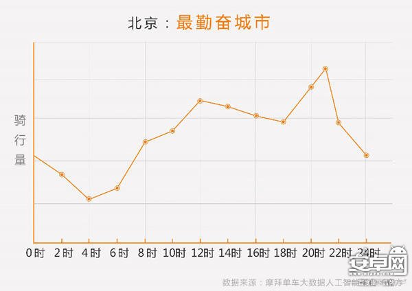 在“五一”期間,共享單車承擔更多的是游玩和聚會的出行工具,各地的騎行高峰較平日都有所延后。其中,北京依舊是“最勤奮”城市,第一個騎行高峰從平時8時左右延后到10時;而海口則“最悠閑”的城市,騎行高峰出現在晚上18時到21時。上海的市民則更偏愛在下午出游,騎行的高峰時間出現在14時到17時,更在17時到達騎行量高峰值。