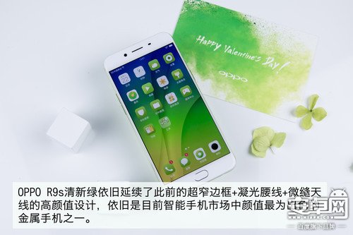 該機在延續R9的極窄邊框與圓潤弧度的設計基礎上,加入了全新的微縫天線技術成功解決機身大白帶問題。此外該機還將屏幕和HOME鍵分別升級到了第五代康寧大猩猩屏幕與具備疏水技術的指紋鍵,使R9s顏值上都有了極為出色的表現。