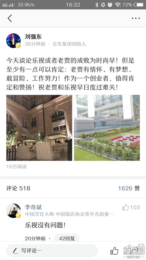 而不少業界大佬也紛紛站出力挺賈躍亭,今天下午,劉強東發文稱:今天談論樂視或者老賈的成敗為時尚早!但是至少有一點可以肯定:老賈有情懷、有夢想、敢冒險、工作努力!作為一個創業者,值得肯定和贊揚!祝老賈和樂視早日度過難關!