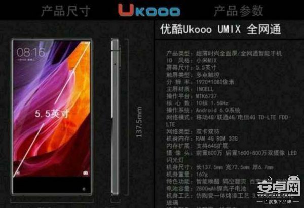山寨手機這一次又走在了前面,一款模仿小米mix的手機,優酷UMIX外觀高度模仿小米mix,配置上,優酷UMIX采用了MTK6737處理器,4G RAM+32G ROM,后置1600萬+800萬雙攝像頭,前置800雙攝像頭,5.5英寸1080P屏幕,2800mAh鋰電池,不支持快充。