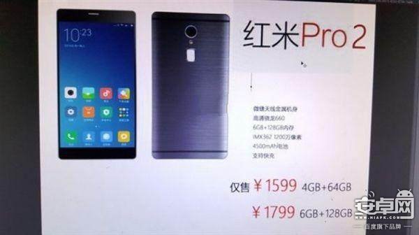 紅米pro2是2017年小米手機低端市場的旗艦機型,紅米pro2采用天馬的5.46英寸全面屏,示比例將會是2:1或者18:9,分辨率2160×1080像素。玻璃機身+金屬中框的設計。處理器為高通驍龍660,4GB運行內存起,32GB存儲內存起,后置雙攝像頭。售價1599元起,頂配1799元。