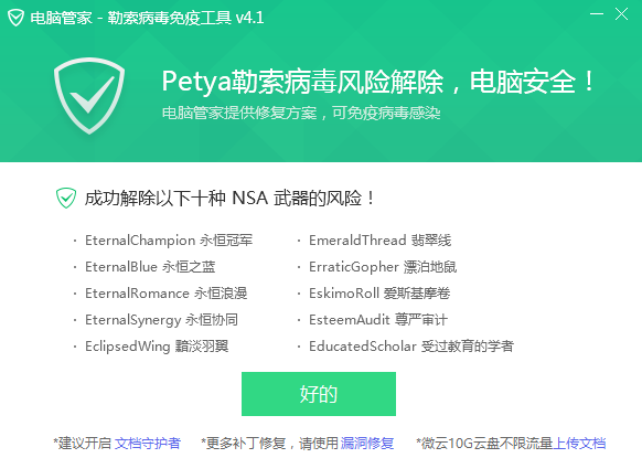近期頻發的勒索病毒事件,讓文檔安全備受威脅,稍有不慎重要文檔就有將成為不法分子受眾的“人質”。基于早前應對勒索病毒的成熟經驗,騰訊電腦管家推出的“勒索病毒免疫工具”已經可以幫助用戶解除十種NSA武器的風險,讓電腦免疫病毒感染,用戶也不必再擔心畢業設計、重要研究數據等重要文檔被加密。