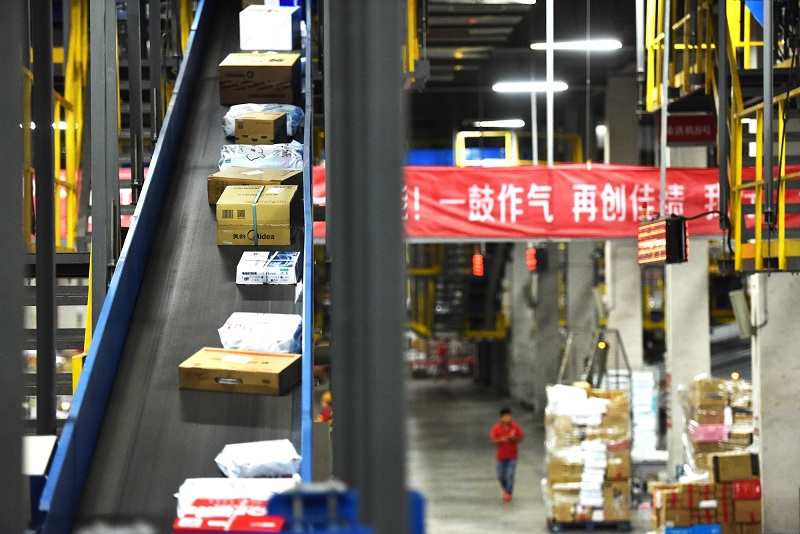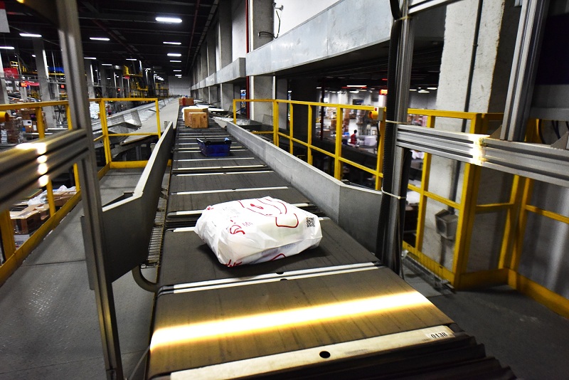 打包好的商品會重新回到傳送帶上,被送至分揀系統。系統通過掃描識別包裹上的配送地點,會將包裹傳送至相對應的貨道,然后由工作人員運走進行發貨。