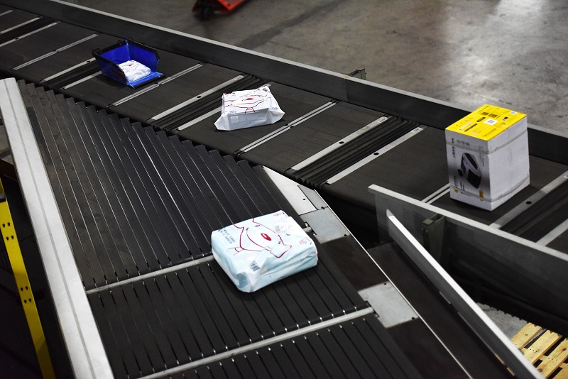 接下來,商品會通過傳送帶來到打包區,并自動分配到空閑的工位。工作人員掃描包裹,然后機器打印出物流信息及發票,打包就完成了。