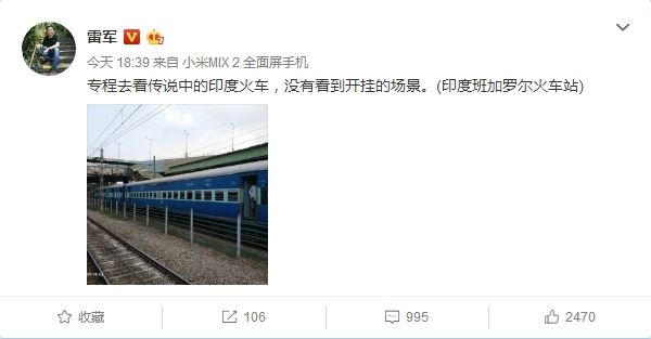 與此同時,雷軍還在印度“上山下鄉”,了解這里的風土人情和市場情況。有意思的是,雷軍還專程去印度班加羅爾火車站看了傳說中的印度火車,沒有看到開掛的場景。