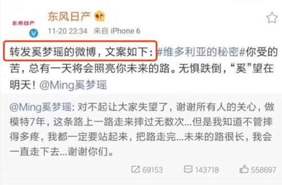 本來是轉發力挺奚夢瑤的微博,但內容卻讓人哭笑不得。雖然隨后已被刪除,但手快的網友已經截圖。從截圖可以看到,在東風日產官微轉發的原文中,“轉發奚夢瑤的微博,文案如下”幾個字赫然在列,場面一度非常尷尬。