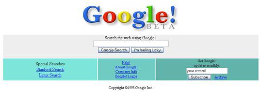 谷歌的創業史起源于兩位創始人的相遇。那時候,拉里·佩奇(Larry Page)正考慮去斯坦福大學讀研究生,而謝爾蓋·布林(Sergey Brin)是斯坦福的學生,帶他去參觀學校。據谷歌官方的介紹,他們第一次見面時,幾乎在任何事情上都意見相左,然而一年后卻成了合作伙伴。兩位創始人