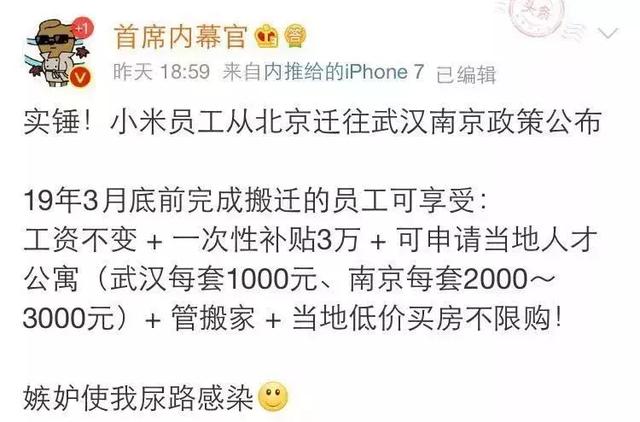 10月12日,網(wǎng)曝小米員工從北京遷往武漢、南京的政策,在2019年3月31日前完成搬遷的員工可享受3萬元搬遷福利費(fèi),可申請(qǐng)一套當(dāng)?shù)厝瞬殴ⅰ?/p>