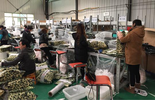 2018年是打包員王華興從事該行業的第5個年頭,他抱著已經裝箱的商品給記者介紹,每個打包區域四人一組,一人將商品裝入泡沫盒,一人封外包裝盒,一人裝箱,最后由王華興用膠帶封箱。