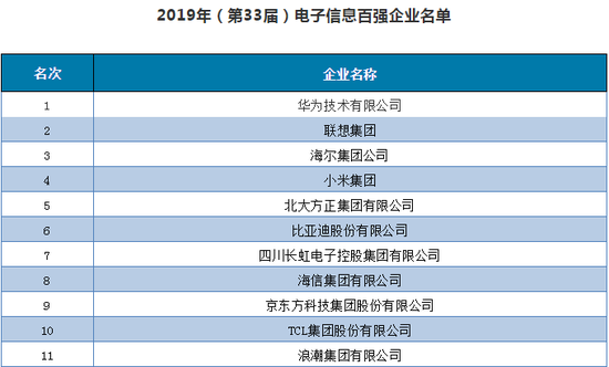 2019年(第33屆)電子信息百強企業名單發布 華為第一聯想第二