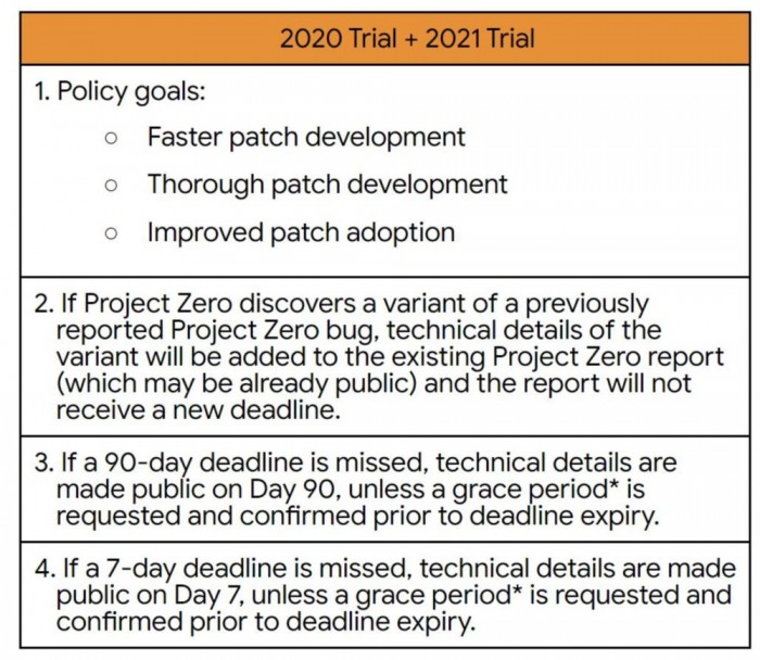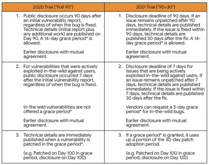 今天的這項調(diào)整對于安全領(lǐng)域來說非常重要,因為目前網(wǎng)絡(luò)安全社區(qū)的很多人都已采用 Project Zero 的規(guī)則作為向軟件供應(yīng)商、向公眾披露安全漏洞的非官方方法。在今天之前,谷歌 Project Zero 的研究人員會給軟件廠商 90 天的時間來修復(fù)一個安全漏洞。當(dāng) bug 被修復(fù)后,或者在 90 天時間窗口結(jié)束時,谷歌研究人員會在網(wǎng)上(在他們的 bug 跟蹤器上)公布有關(guān) bug 的細(xì)節(jié)。