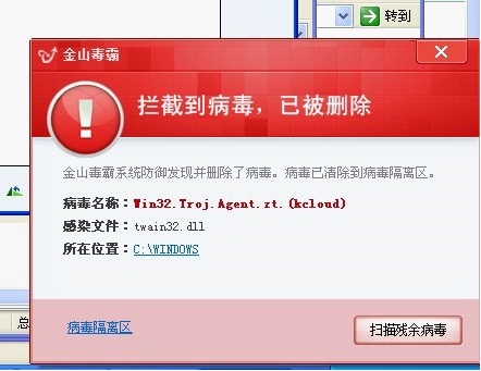 部分殺毒軟件在處理該病毒時,只是刪除了病毒執行文件,而未將病毒創建的快捷方式刪除。中毒用戶按空格鍵時,就會立刻報告“加載twain32.dll時出錯”。由于該病毒的最終目的是遠程控制用戶電腦,使玩家面臨極大危險。建議發現按空格鍵異常的網友立刻使用金山毒霸強力查殺。
