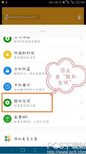 1.進(jìn)入到360手機(jī)衛(wèi)士之后,可以看到隱私空間,點(diǎn)開(kāi)它。