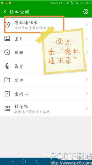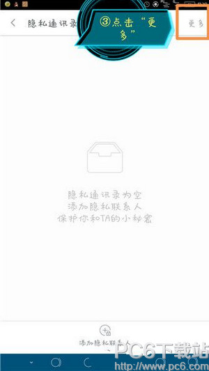 2.進(jìn)入到隱私空間之后你會(huì)看到如圖所示的,隱私通訊錄,點(diǎn)開(kāi)它。點(diǎn)開(kāi)之后,在右上角,找到【更多】,點(diǎn)擊更多,如圖。