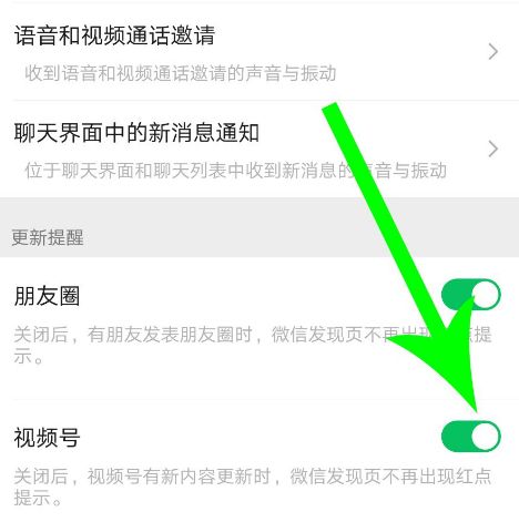 5、滑動至界面底部,然后點擊“視頻號”右側的綠色“開關”按鈕,按鈕變成灰色后,微信視頻號就不會出現紅點提醒了。