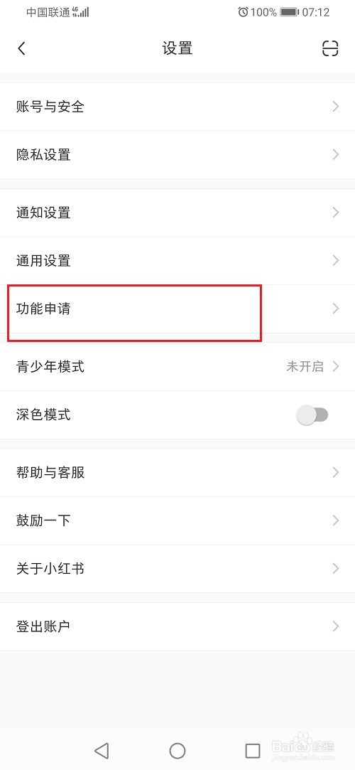 第二步進去小紅書設置之后,點擊功能申請,如下圖所示: