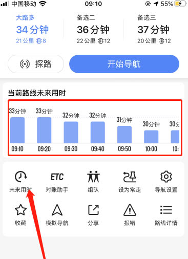 4、看到當先路線只有之后幾個小時花費的時間,我們點擊【未來用時】