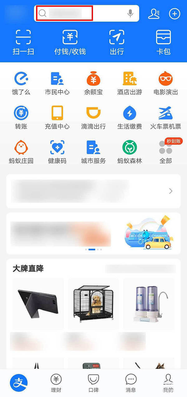 1、打開支付寶,進入支付寶首頁,點擊上方搜索框,輸入智能亞運一站通,點擊搜索;