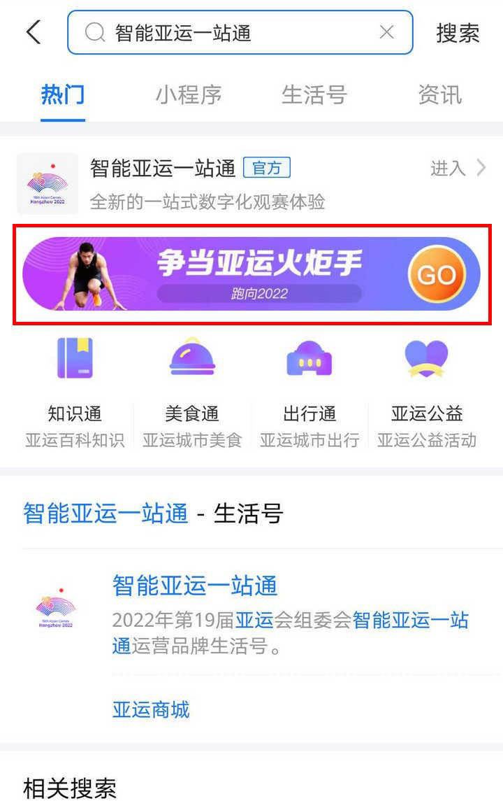 2、在搜索結果中,點擊第一項“智能亞運一站通”里的爭當亞運火炬手;