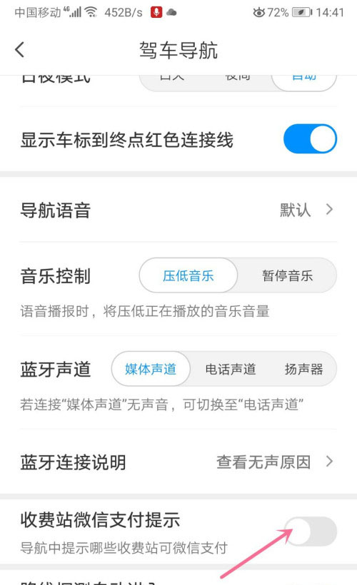 5、切換到駕車導航的頁面在收費站微信支付提示欄選擇“開關”按鈕。