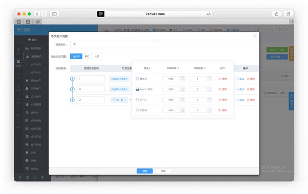 根據公司的銷售模式,設置每個階段的流程節點以及處理人員。流程可以設置適用范圍,設置之后,只有范圍內的員工可以使用該流程。