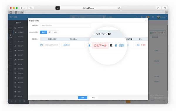 例如:可以設置成交訂單金額大于零時自動轉到下一步,這樣當這一節點的負責人錄入了成交金額大于零的成交訂單時,系統會自動轉到下一節點。