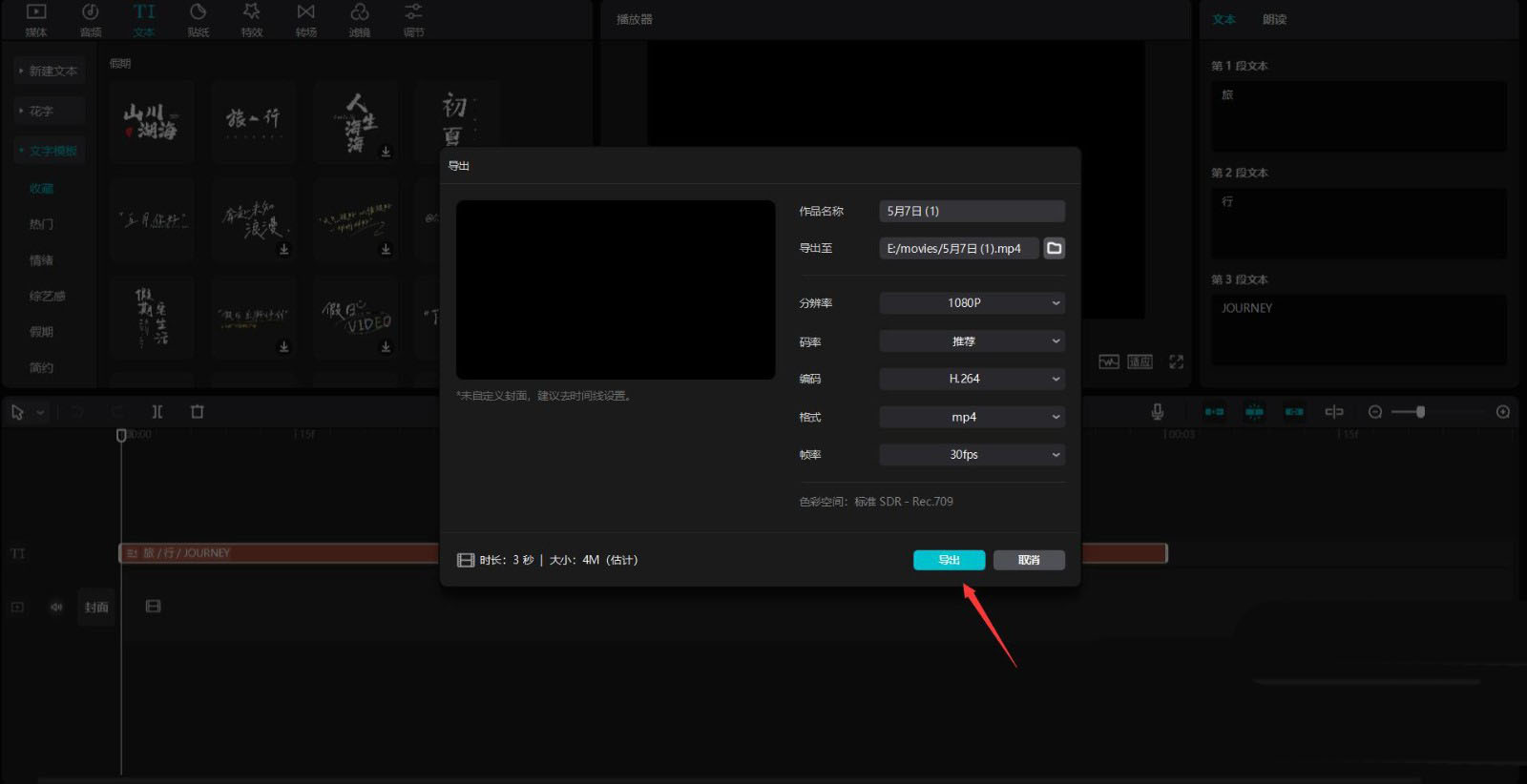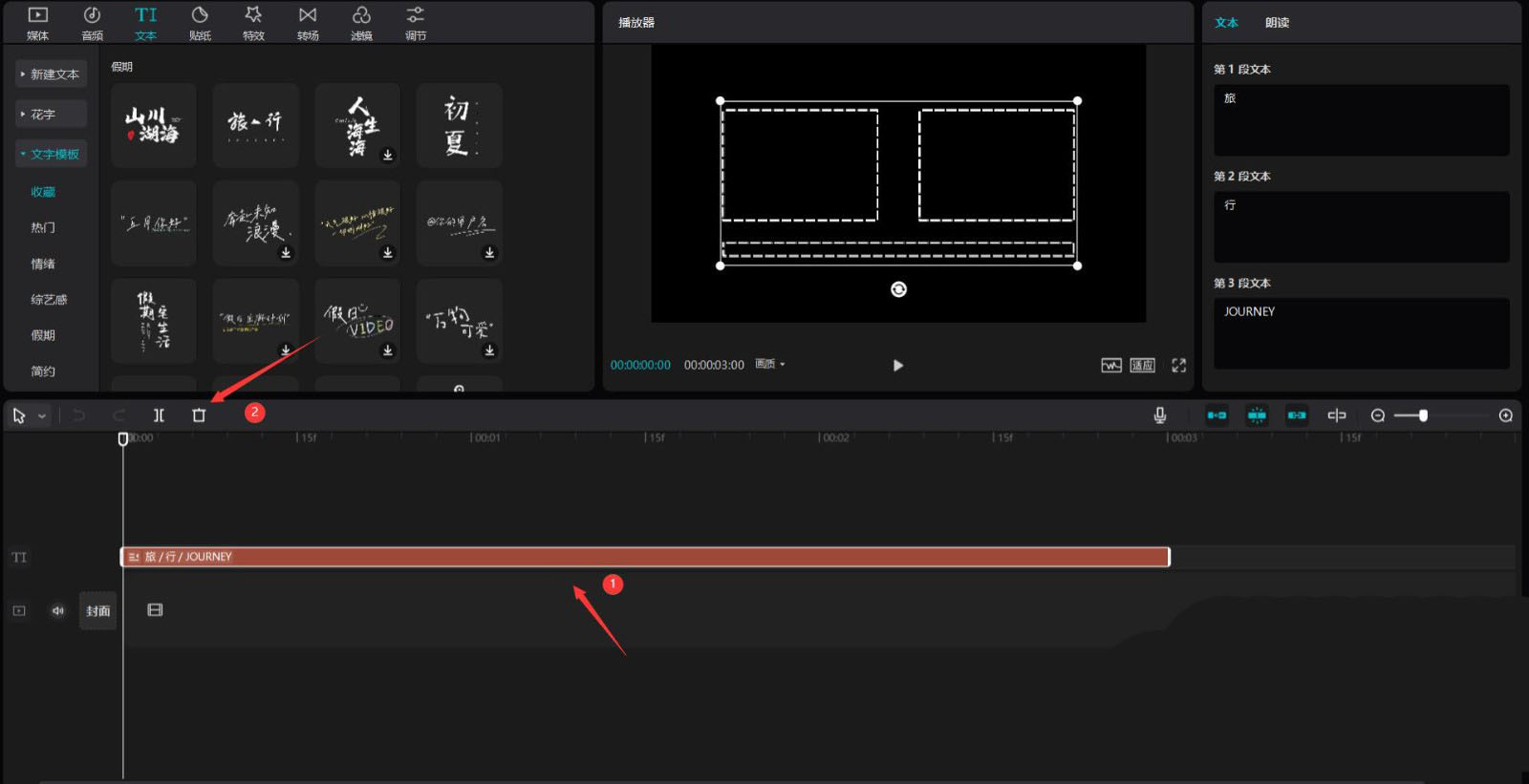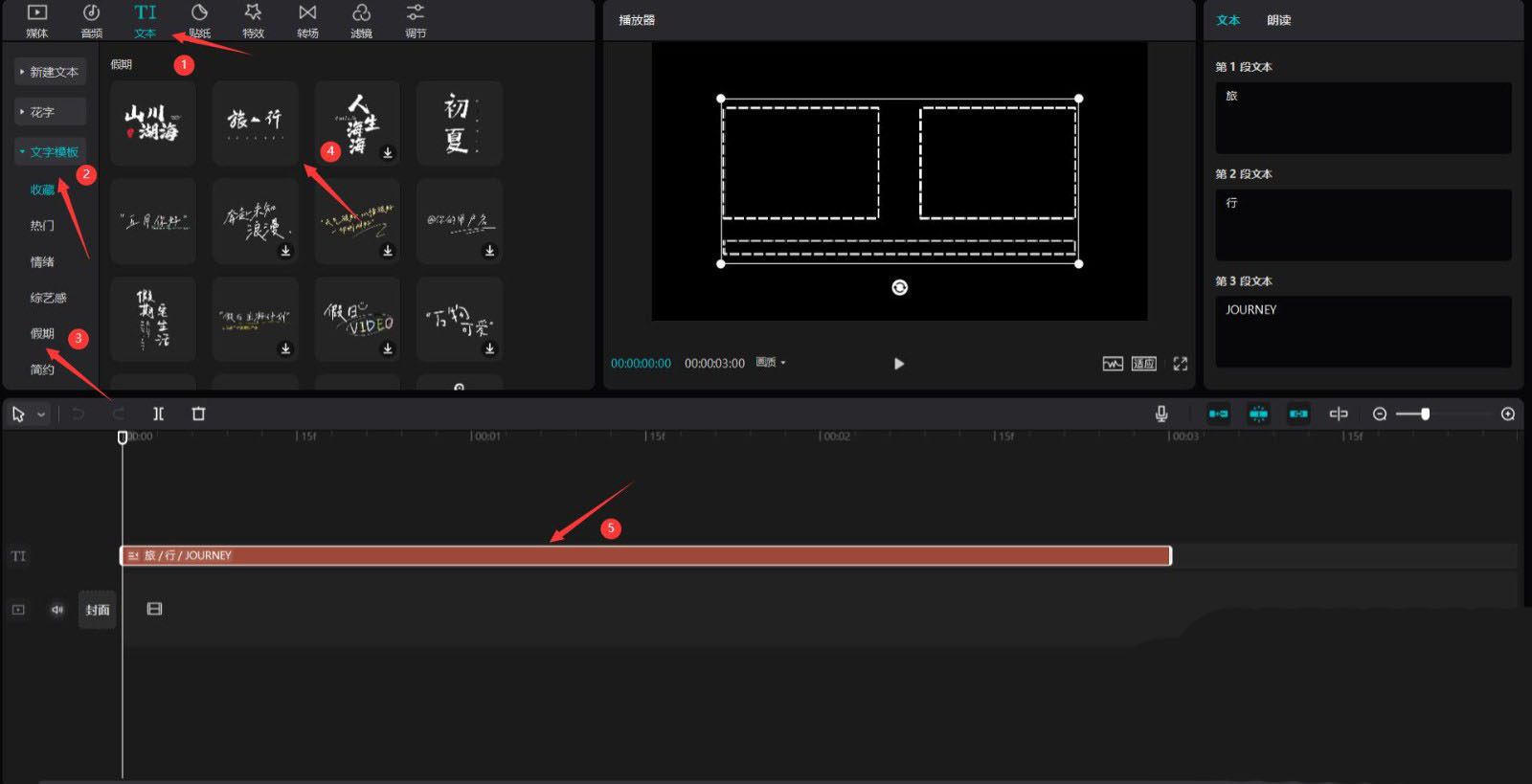 點(diǎn)擊文本按鈕,然后點(diǎn)擊文字模板按鈕,選擇假期中的一個(gè)模板,將其添加到文本軌道中,見(jiàn)下圖。