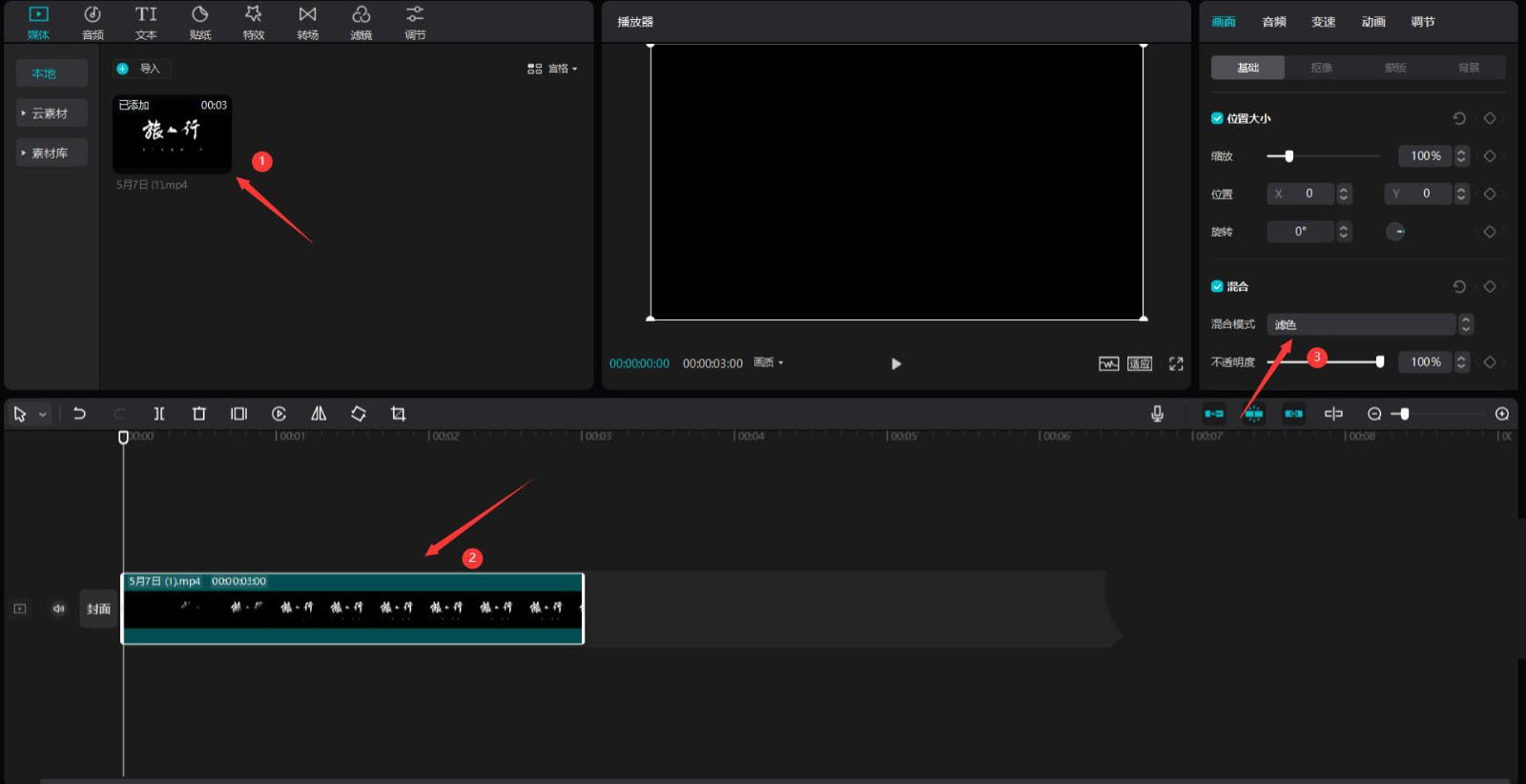 選中導(dǎo)入的視頻,將其添加到視頻軌道中,然后更改混合模式為濾色,見(jiàn)下圖。