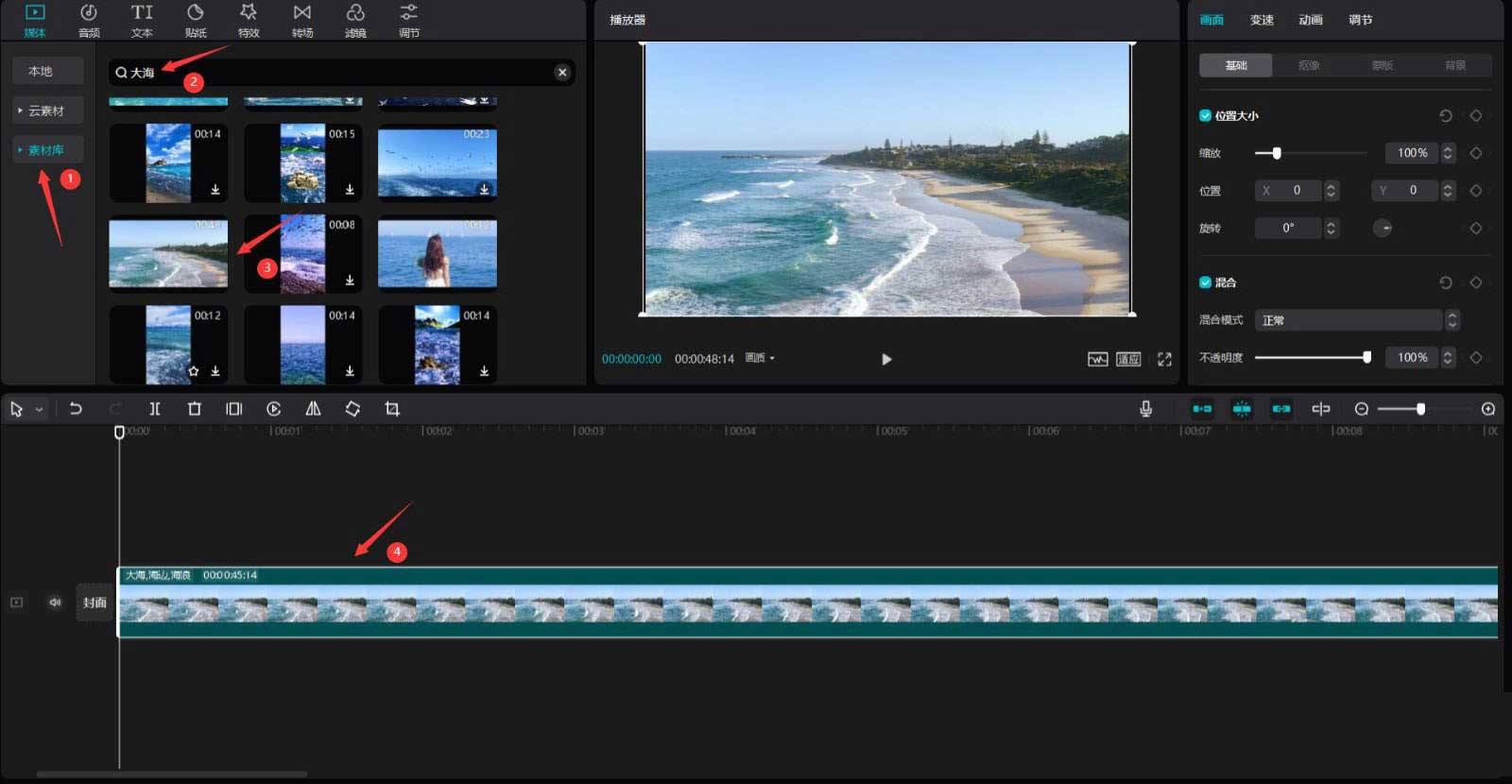 點(diǎn)擊素材庫(kù)按鈕,在搜索欄中輸入大海兩字,選擇一段視頻素材,將其添加到視頻軌道中,見(jiàn)下圖。