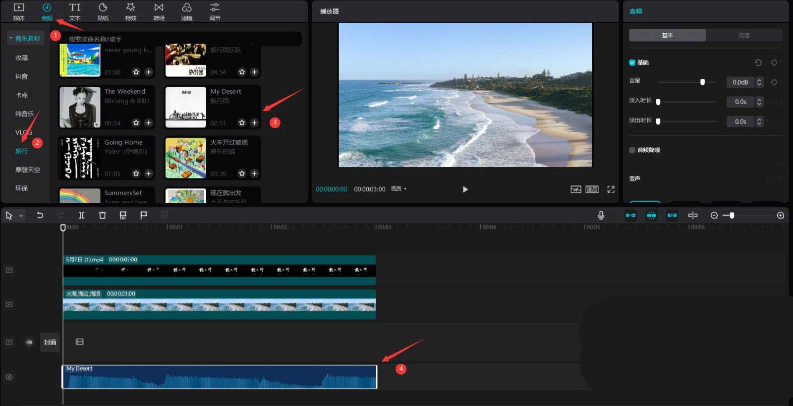 點(diǎn)擊音頻按鈕,選擇旅行中的一段音樂(lè),將其添加到音頻軌道中,然后調(diào)整音頻的結(jié)尾和其他素材的結(jié)尾對(duì)齊,見(jiàn)下圖。