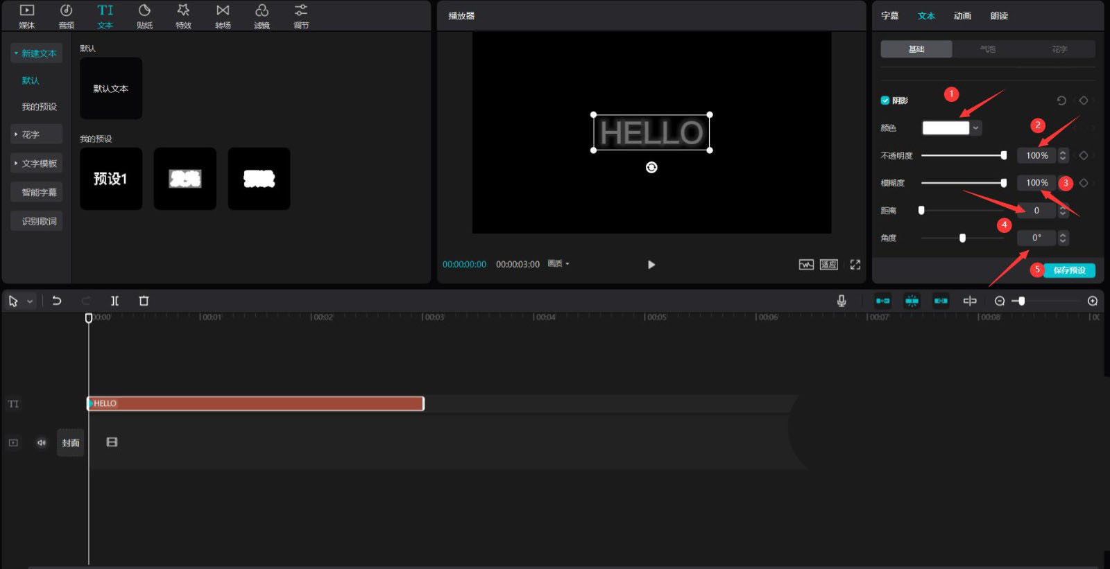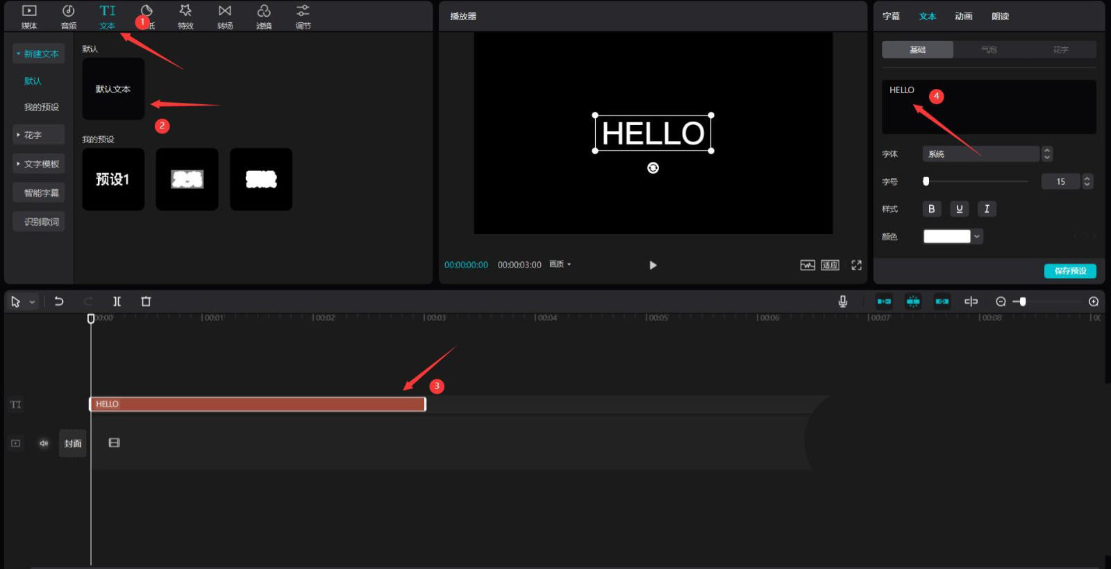 點擊文本按鈕,選擇默認(rèn)文本,將其添加到文本軌道中,然后更改文本內(nèi)容為你想展示的內(nèi)容,見下圖。