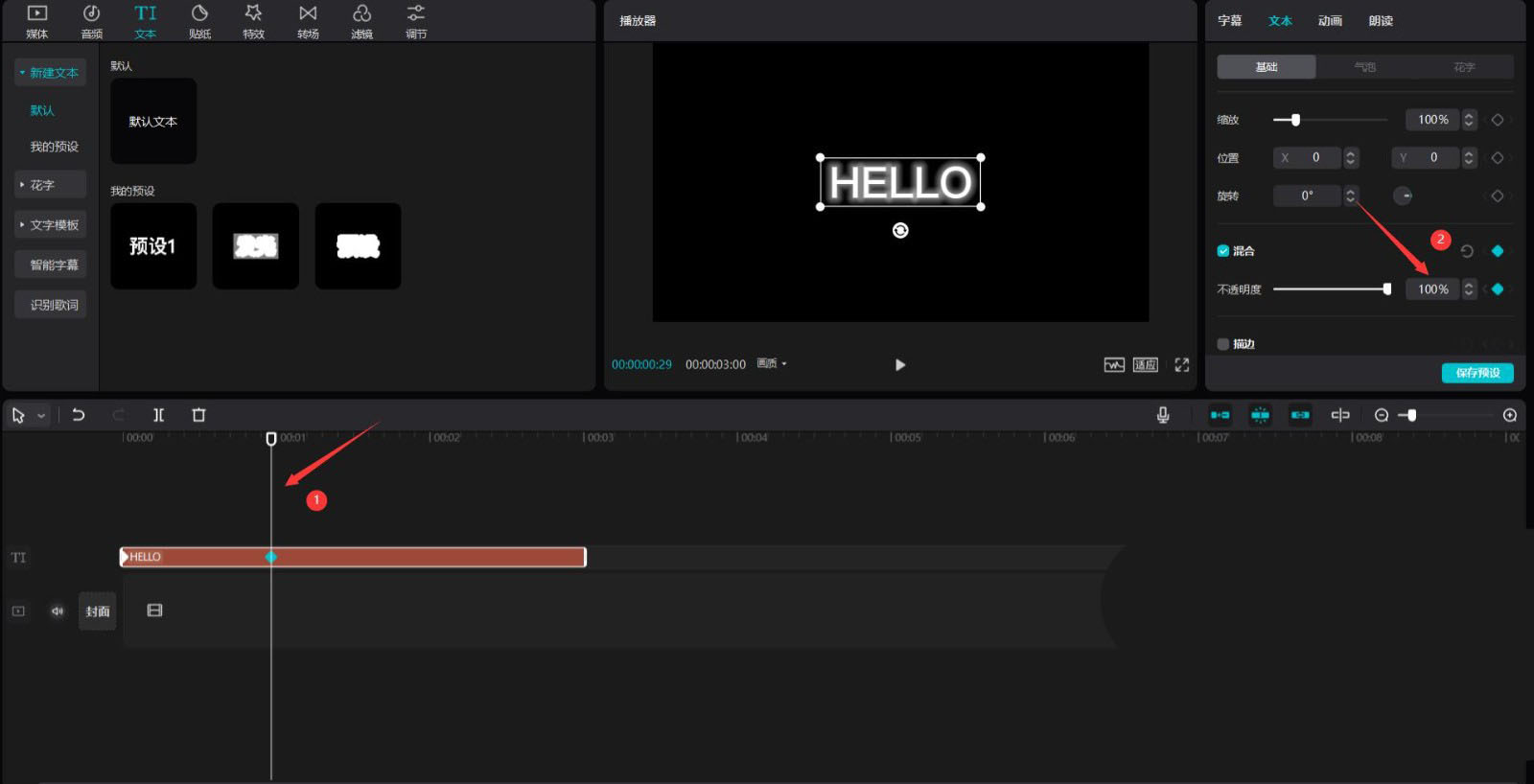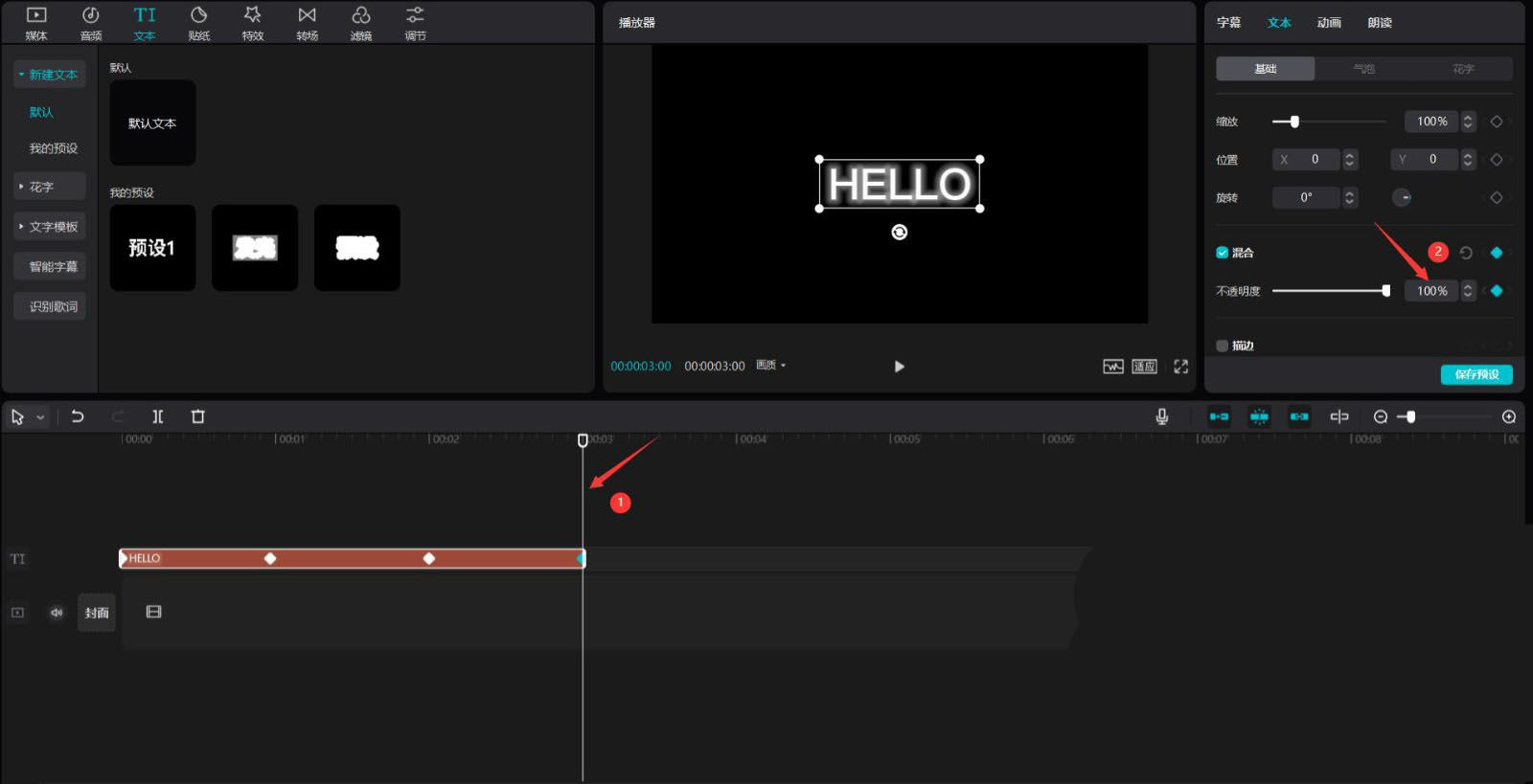 將時間軸移動到1秒處,更改不透明度為100%,見下圖。