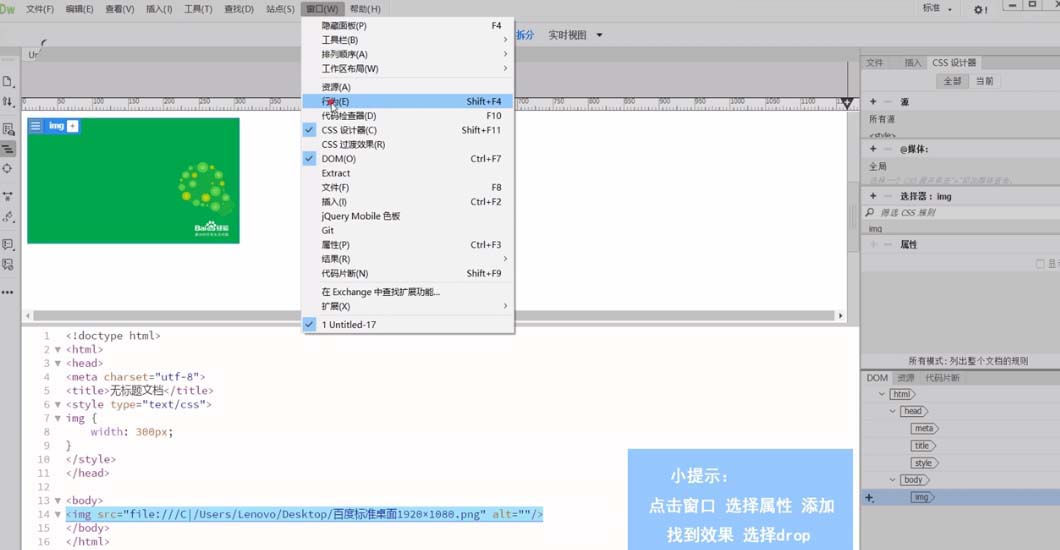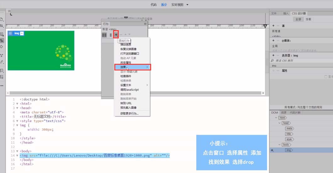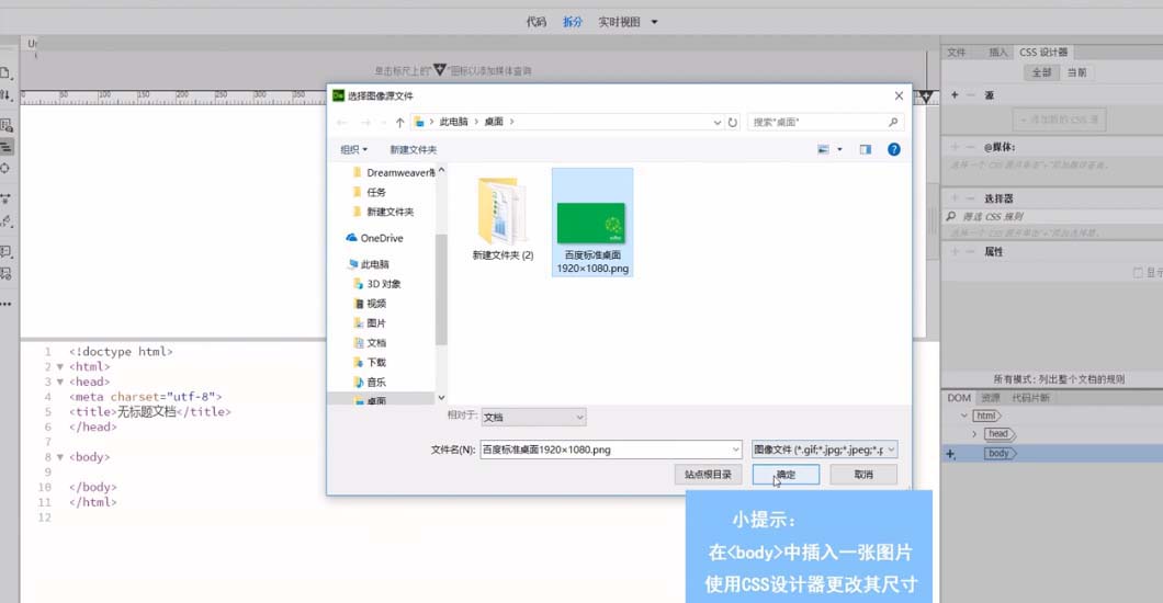 2、在中插入一張圖片,使用CSS設計器更改其尺寸大小。