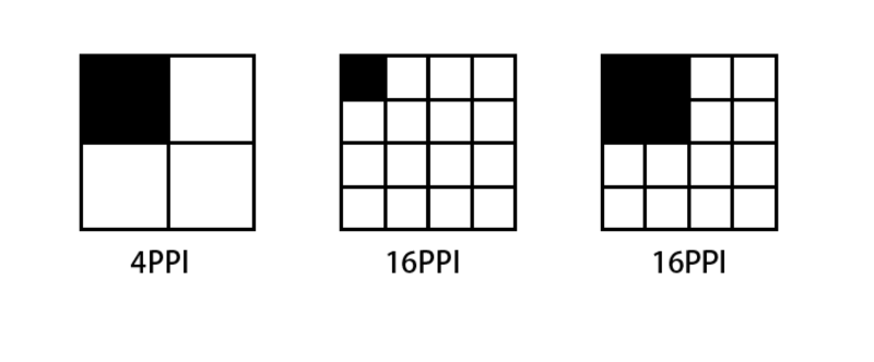 越高PPI的屏幕,顯示一個像素點的面積就越小,一張由4x4個像素點組成的圖顯示在PPI為64的屏幕上,那么換到256PPI的屏幕上顯示則會縮小為原來大小的一半。