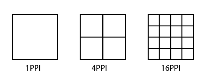 PPI(Pixel Per Inch),即表示每英寸有多少像素,類似于人口密度和建筑密度,如下圖舉例了幾種PPI的表示。